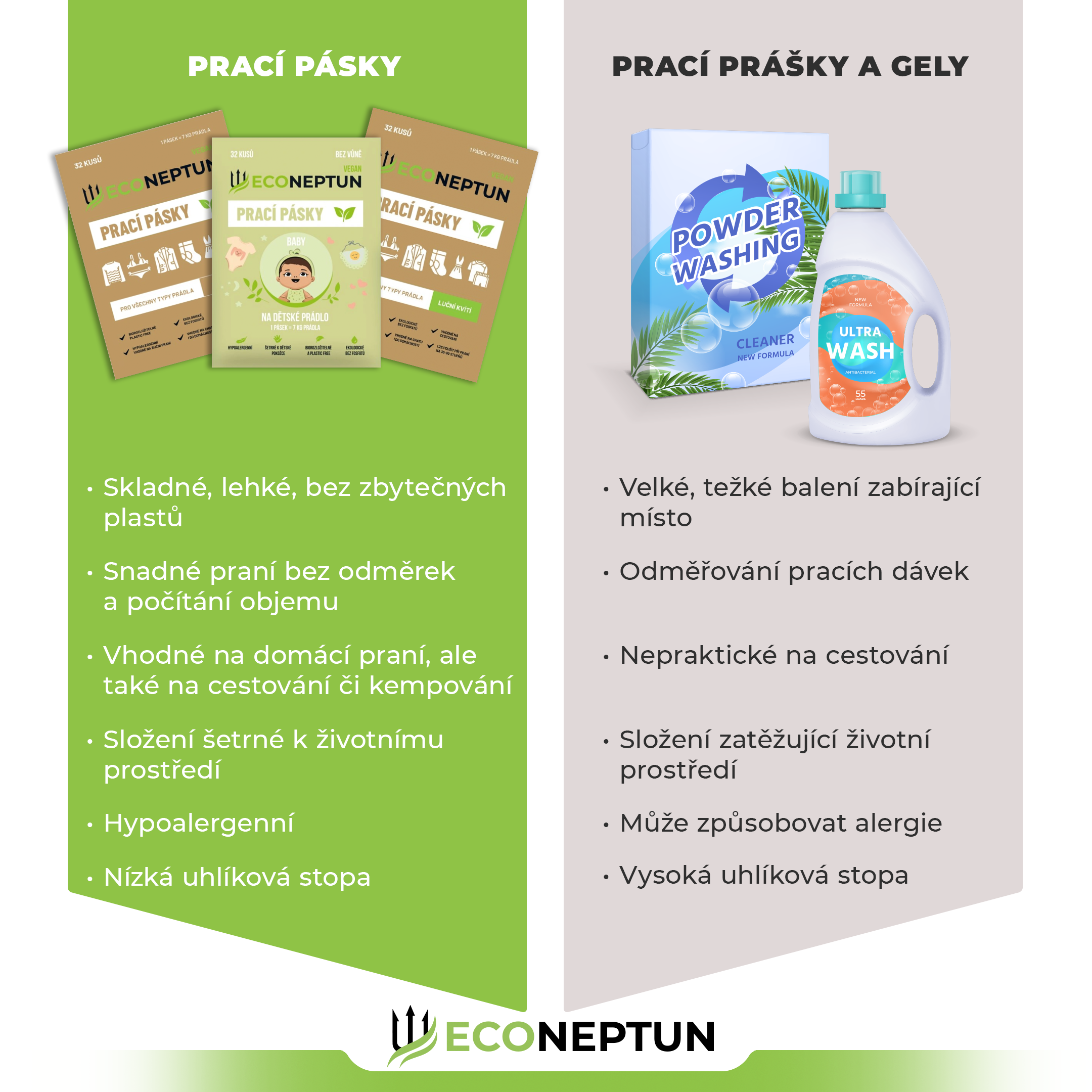- Jedete kempovat? Na dovolenou? Přibalte si s sebou prací pásky od EcoNeptunu. V ruce s nimi hravě vyperete pavky, spodní prádlo, ale také ušpiněné tričko či šortky!